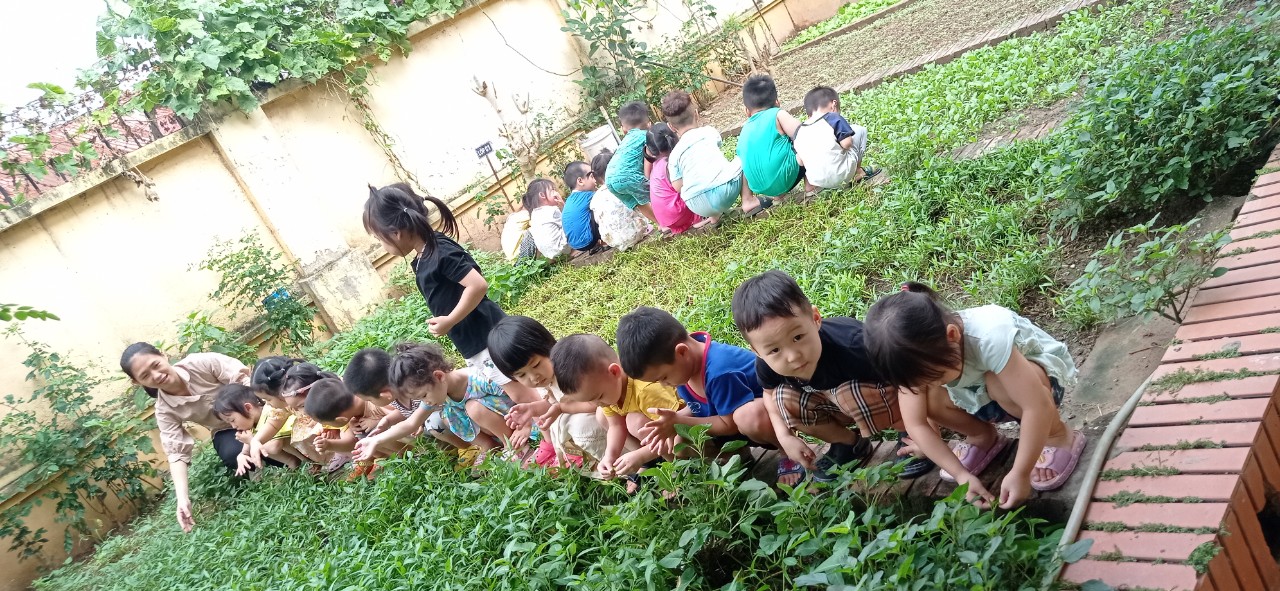Từ rất sớm các bé đã rất háo hức để được đến Vườn rau xem tận mắt, sờ tận tay các loại rau quả hàng ngày bé thường thấy ở trường và ở nhà. Đến vườn rau, các bé có những trải nghiệm rất tuyệt vời khi được các cô giới thiệu về các loại rau như: Rau mồng tơi, rau khổ qua, rau hành, bí, cà tím…Hoạt động này sẽ giúp trẻ hoàn thiện kỹ năng sống, yêu thiên nhiên và bảo vệ môi trường.