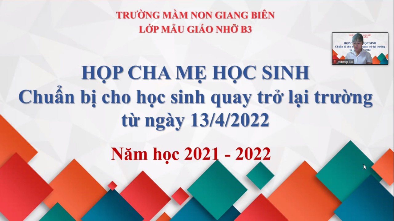 Tối ngày 11 và ngày 12/4/2022, các lớp đã tổ chức họp phụ huynh học sinh qua zoom để triển khai một số nội dung đón trẻ quay trở lại trường học. Các đồng chí giáo viên chủ nhiệm các lớp đã thông báo tới phụ huynh các nội quy và những việc làm cần sự phối hợp của phụ huynh học sinh như: Đo thân nhiệt cho trẻ trước khi đến trường, sát khuẩn tay và đo thân nhiệt tại cổng trường, thực hiện phân luồng đảm bảo đúng theo dãn cách....