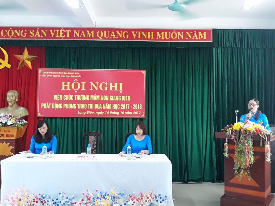 Sáng ngày 14/10/2017, trường Mầm non Giang biên đã tiến hành tổ chức hội nghị viên chức, phát động phong trào thi đua năm học 2017 - 2018