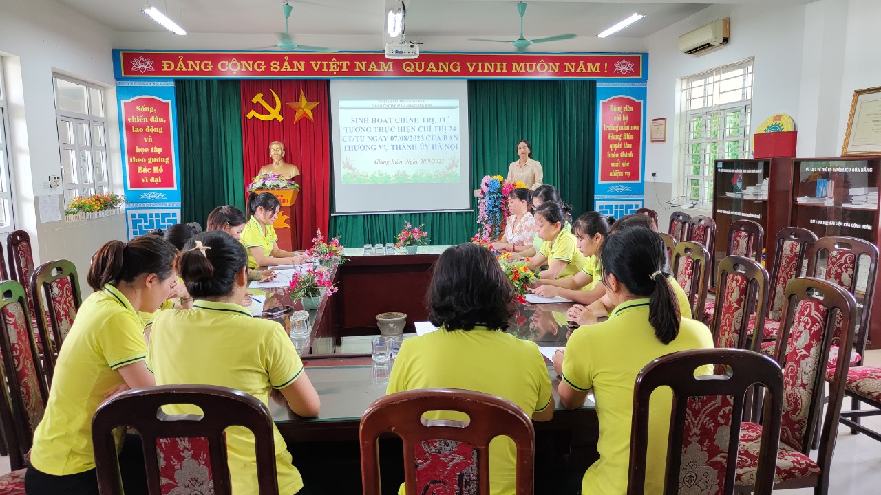 Trưa ngày 20/9/2023 chi bộ trường mầm non Giang Biên tổ chức sinh hoạt Đảng chuyên đề với nội dung "Sinh hoạt chính trị, tư tưởng thực hiện chỉ thị 24/ CT/TW ngày 07/8/2023 của ban thường vụ Thành Ủy Hà Nội". Tại buổi sinh hoạt chi bộ có đồng chí Hoàng Thị Phương đã chủ trì buổi sinh hoạt và triển khai các nội dung trọng tâm của cấp trên, các đồng chí đảng viên có mặt đầy đủ, đúng giờ, chăm chú tiếp thu nội dung của buổi sinh hoạt chuyên đề