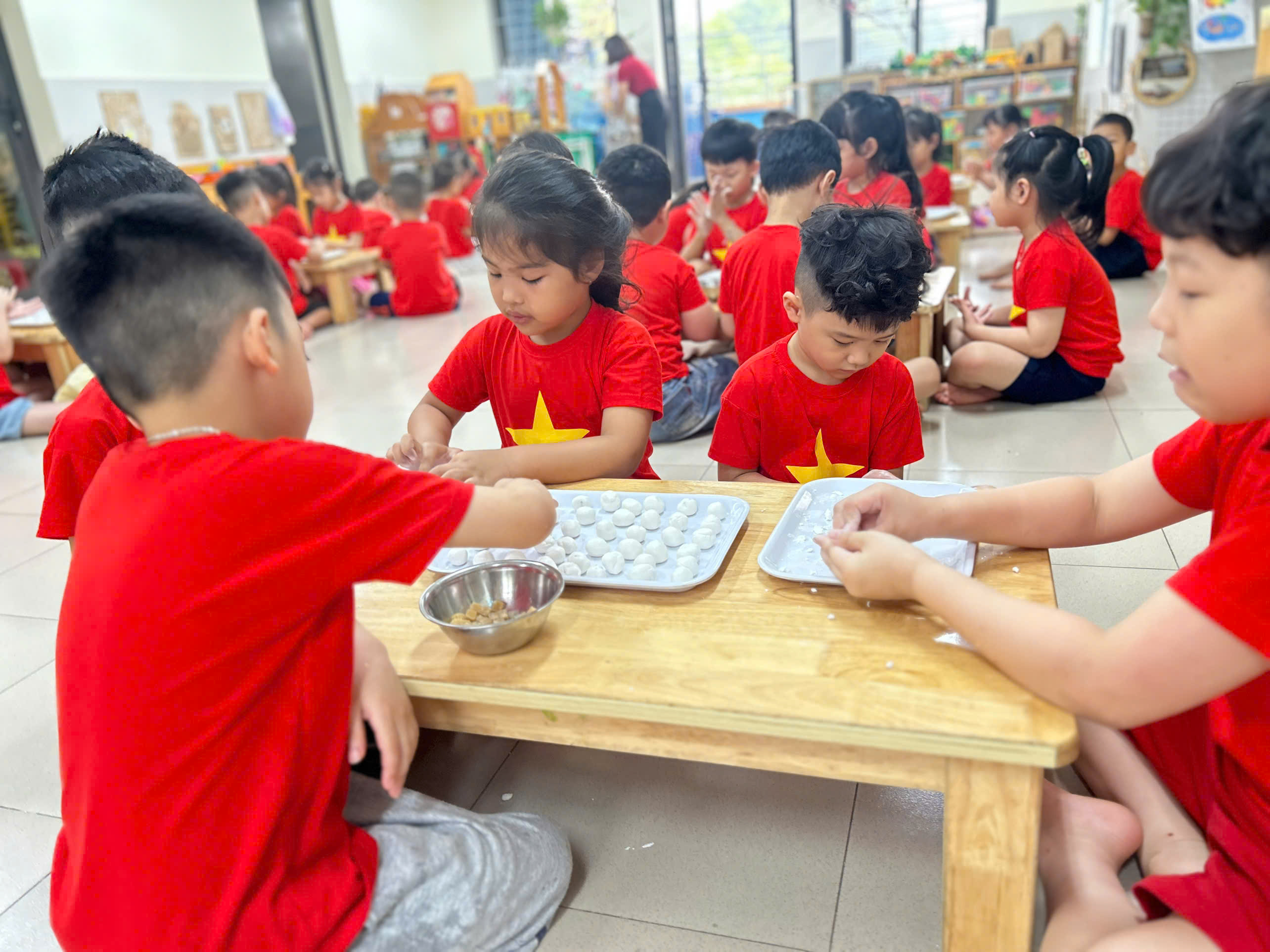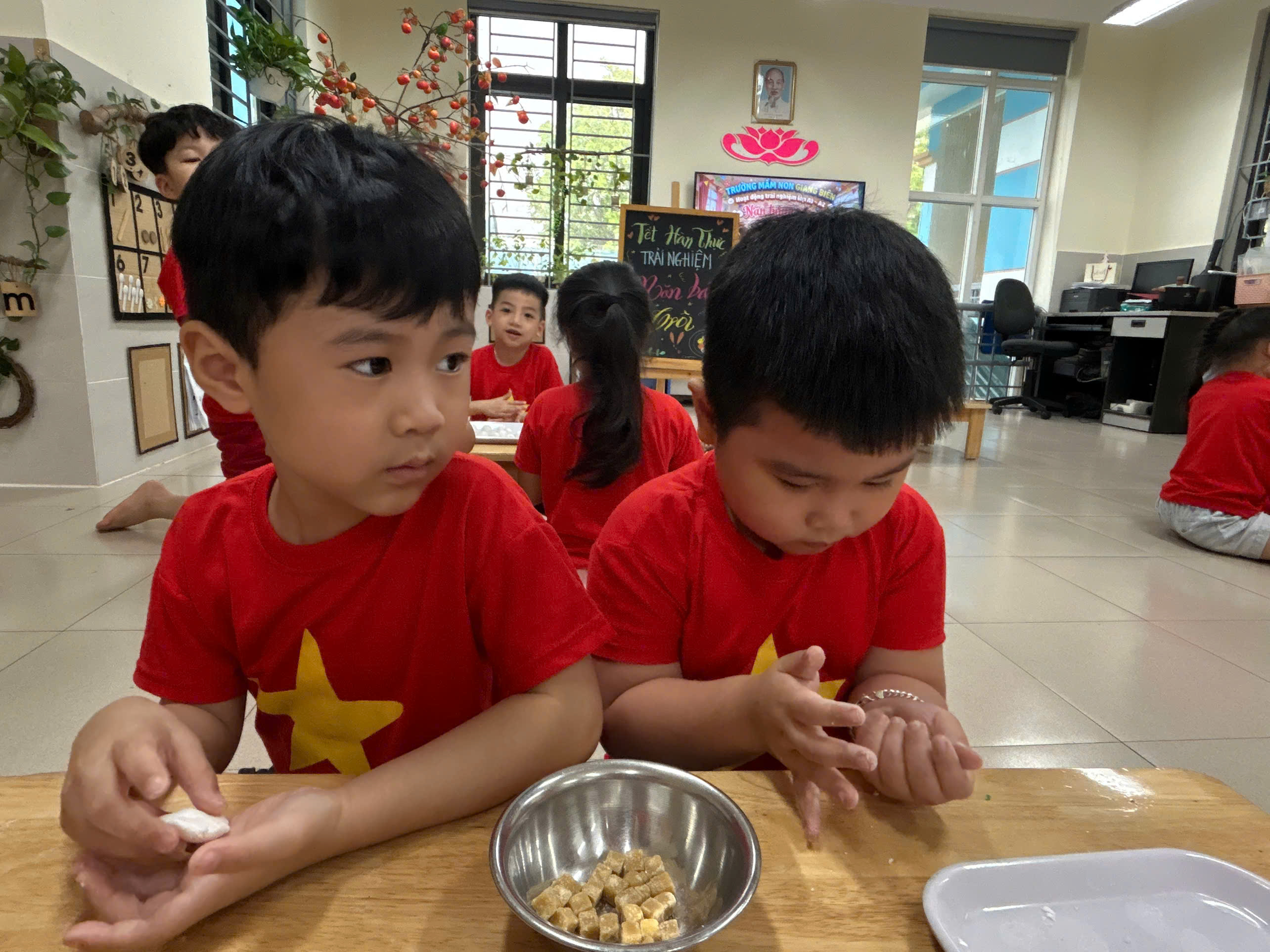 Dưới sự hướng dẫn của cô giáo, các con được làm quen với nguyên liệu như bột nếp, đường, nước… 🥣. Từng bước nặn bánh, vo tròn, thả bánh vào nồi nước sôi đều khiến các bé vô cùng hào hứng 😄