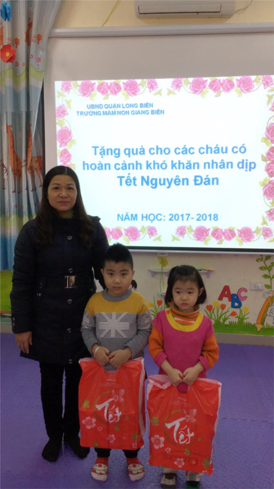 Ngày 8/2/2018, đồng chí Nguyễn Thị Mỵ- Bí thư chi bộ- Hiệu trưởng nhà trường đã tặng quà cho các cháu có hoàn cảnh khó khăn nhân dịp Tết Nguyên Đán. Đây là hoạt động được diễn ra thường xuyên hàng năm trong dịp tết Nguyên Đán của trường mầm non Giang Biên. Món quà tuy nhỏ nhưng chứa đựng nhiều tình cảm của các cô dành cho các con có hoàn cảnh khó khăn trong những dịp tết. Đây là nguồn động viên tinh thần cho các bé để các bé có một cái tết đầy đủ, ấm cúng hơn.