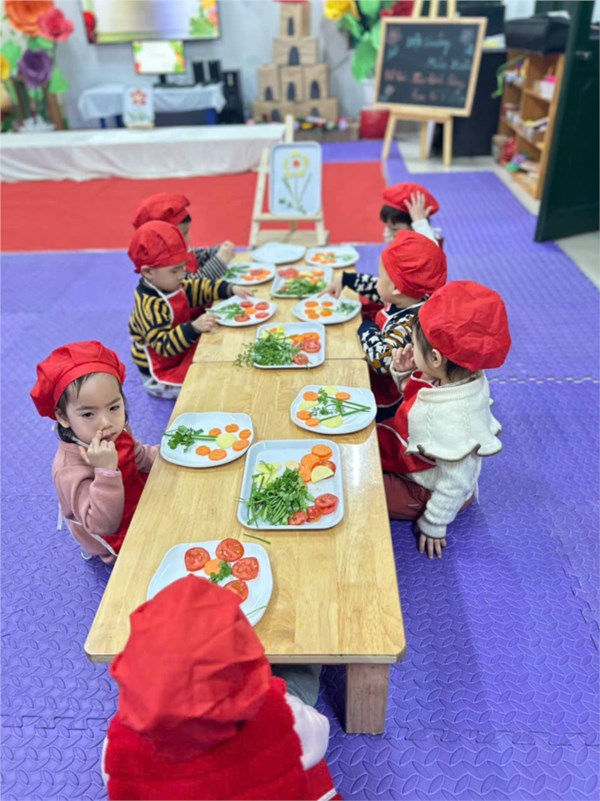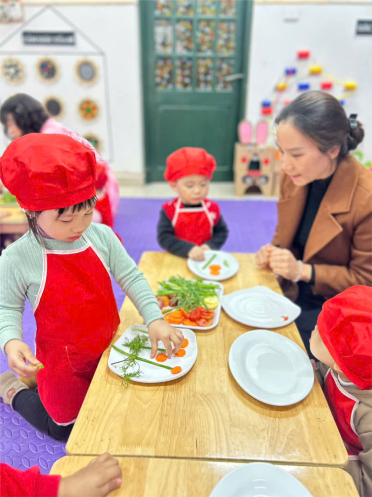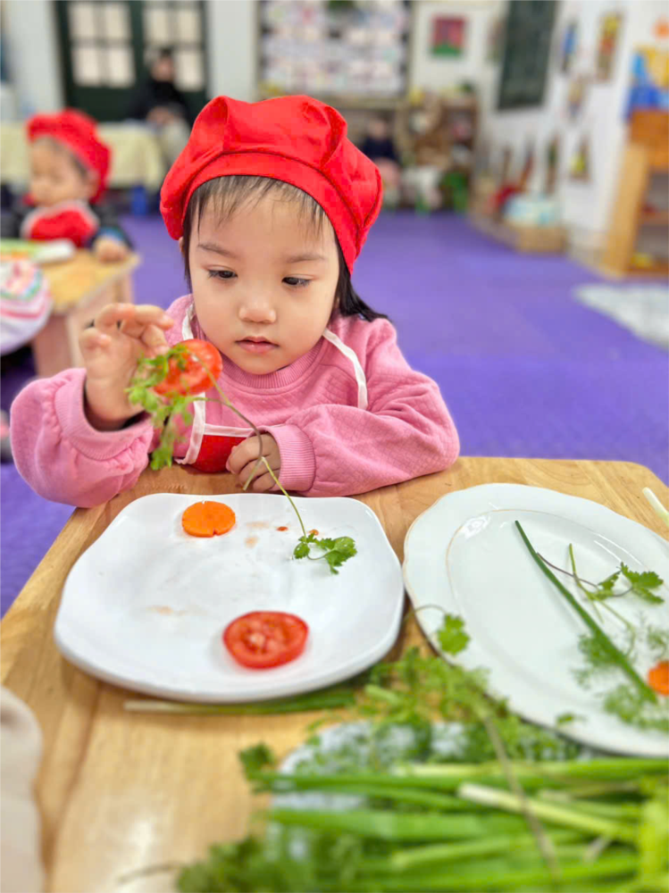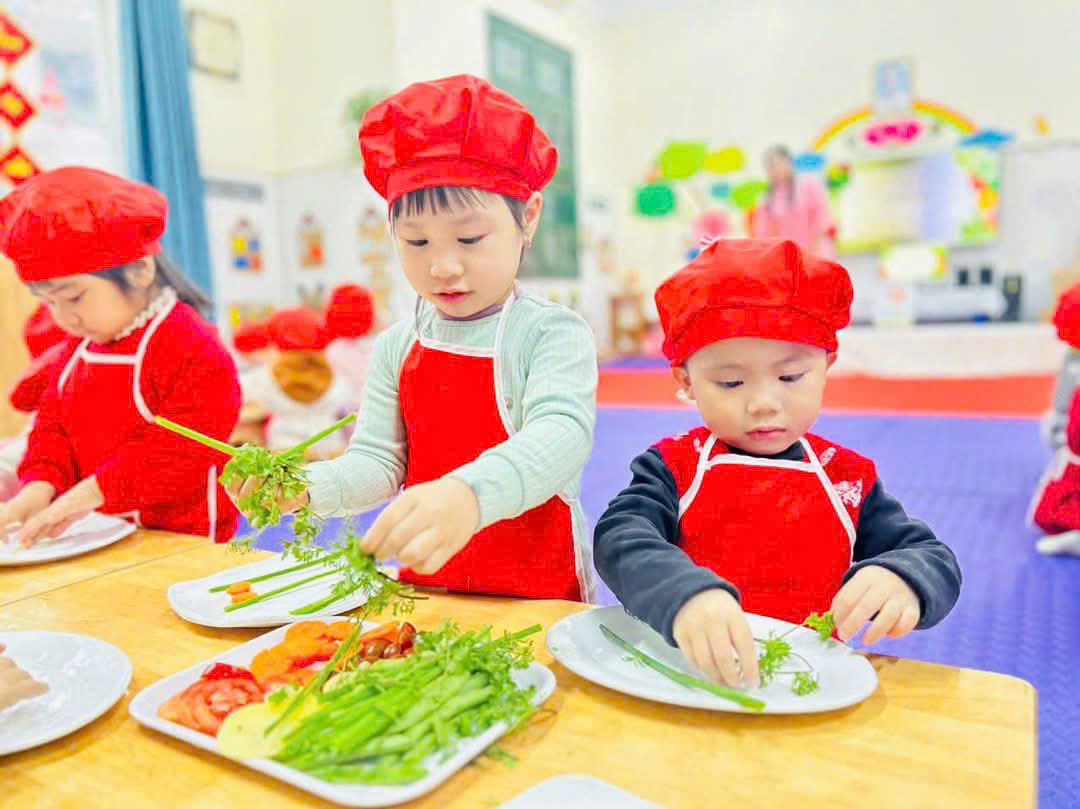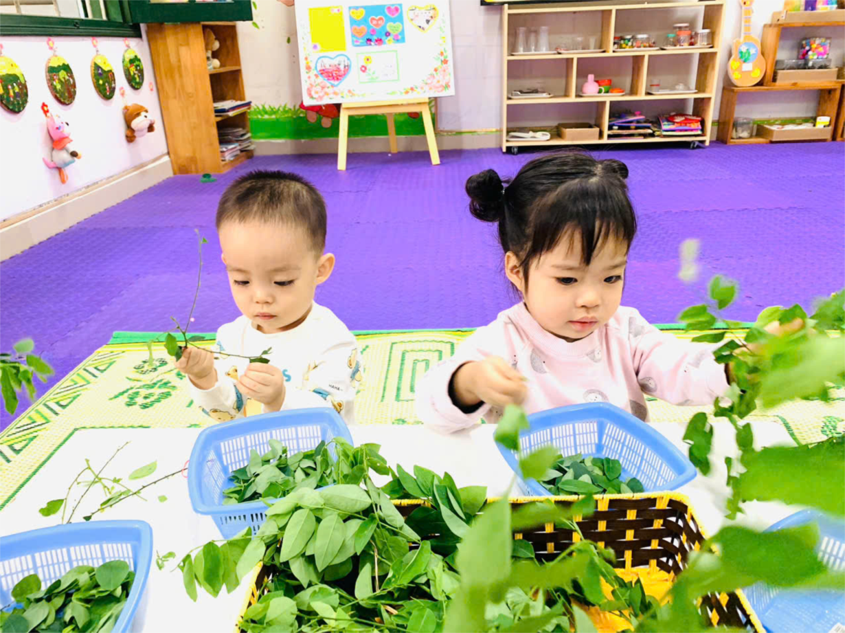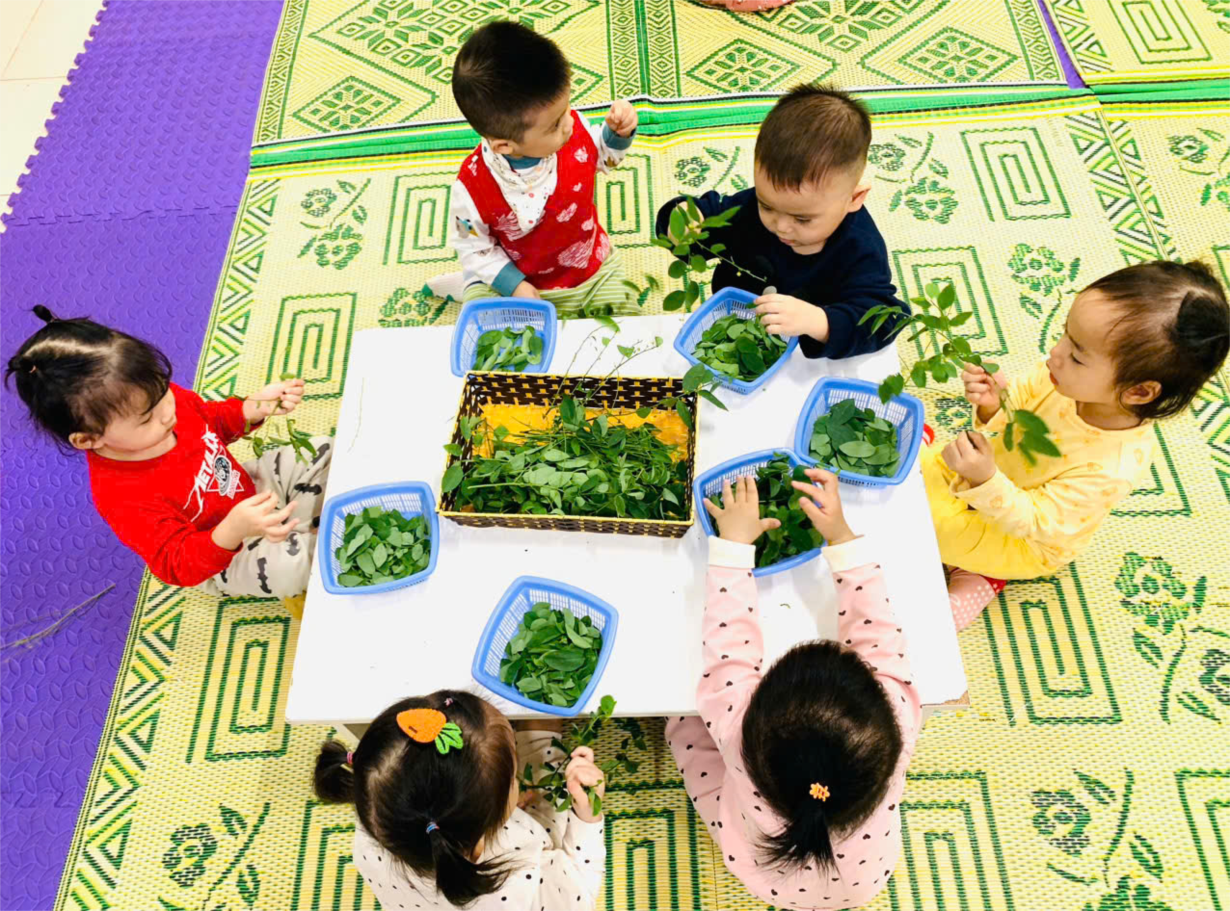Một số hình ảnh các bé lớp NTD1 nhặt rau giúp mẹ