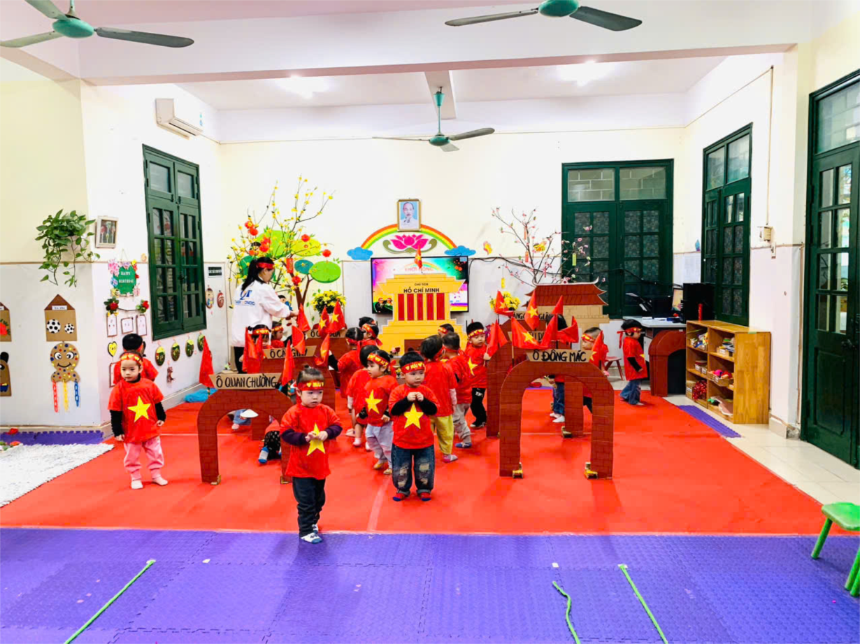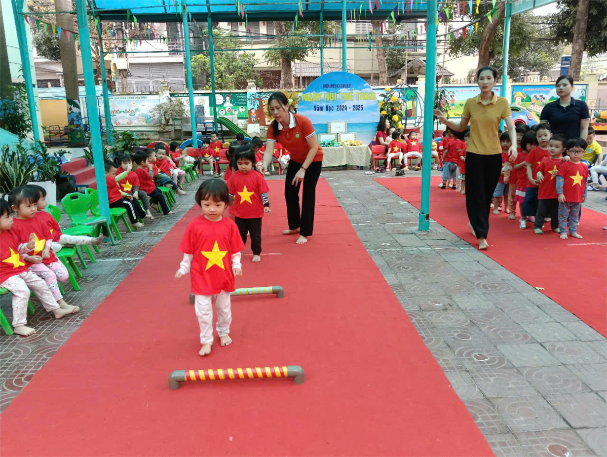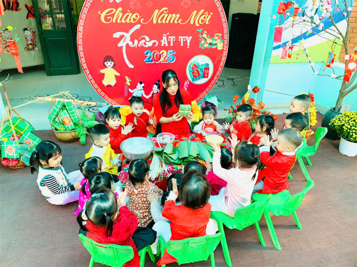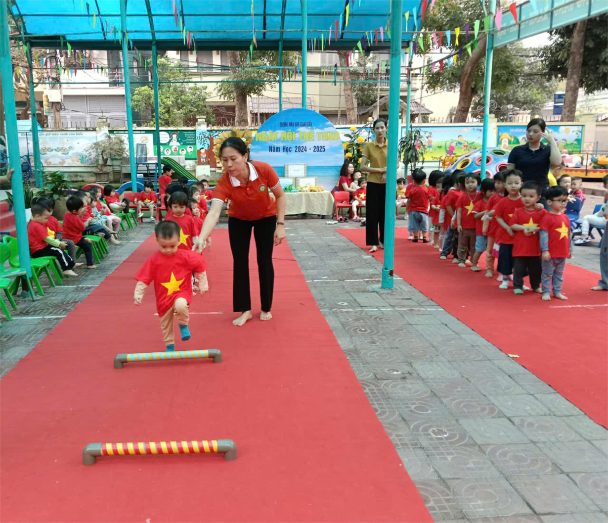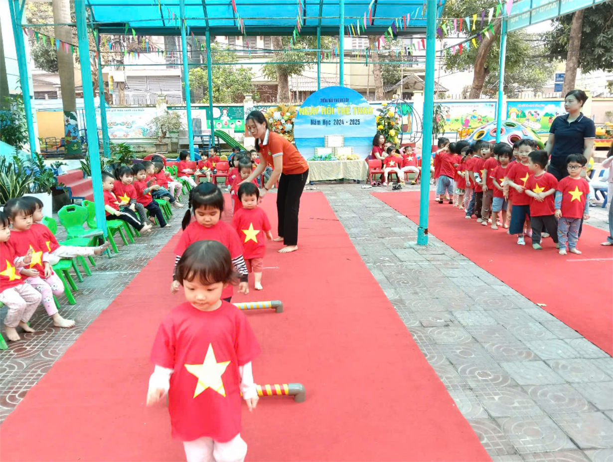Cô và các bạn lớp nhà trẻ D1 cùng tham gia liên hoan chúng cháu vui khỏe