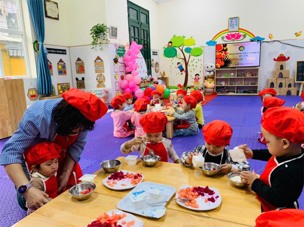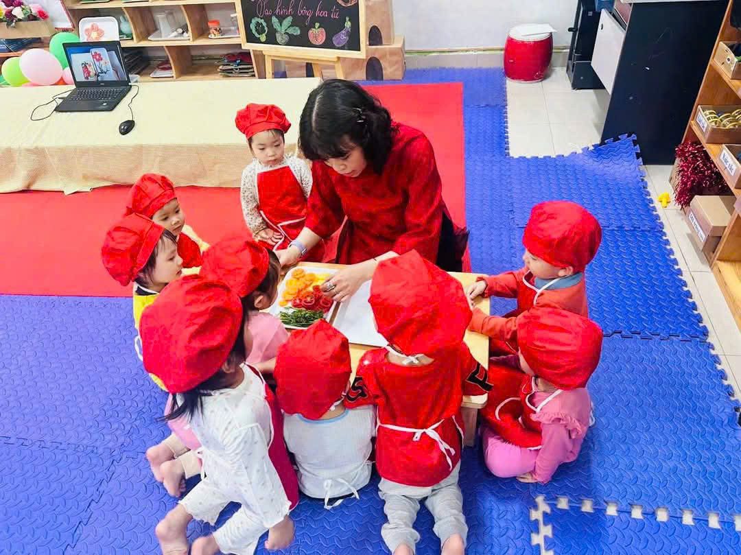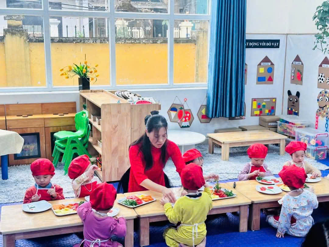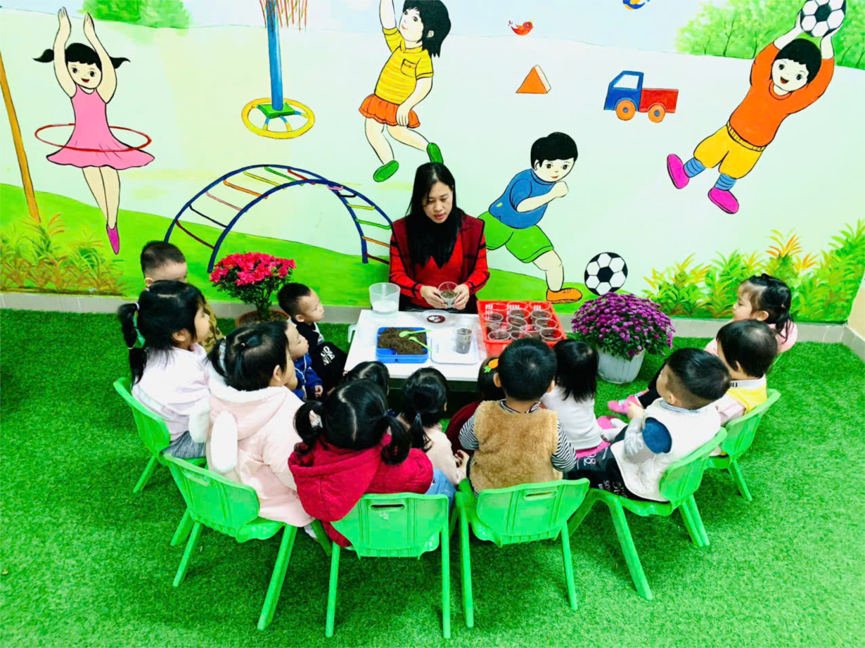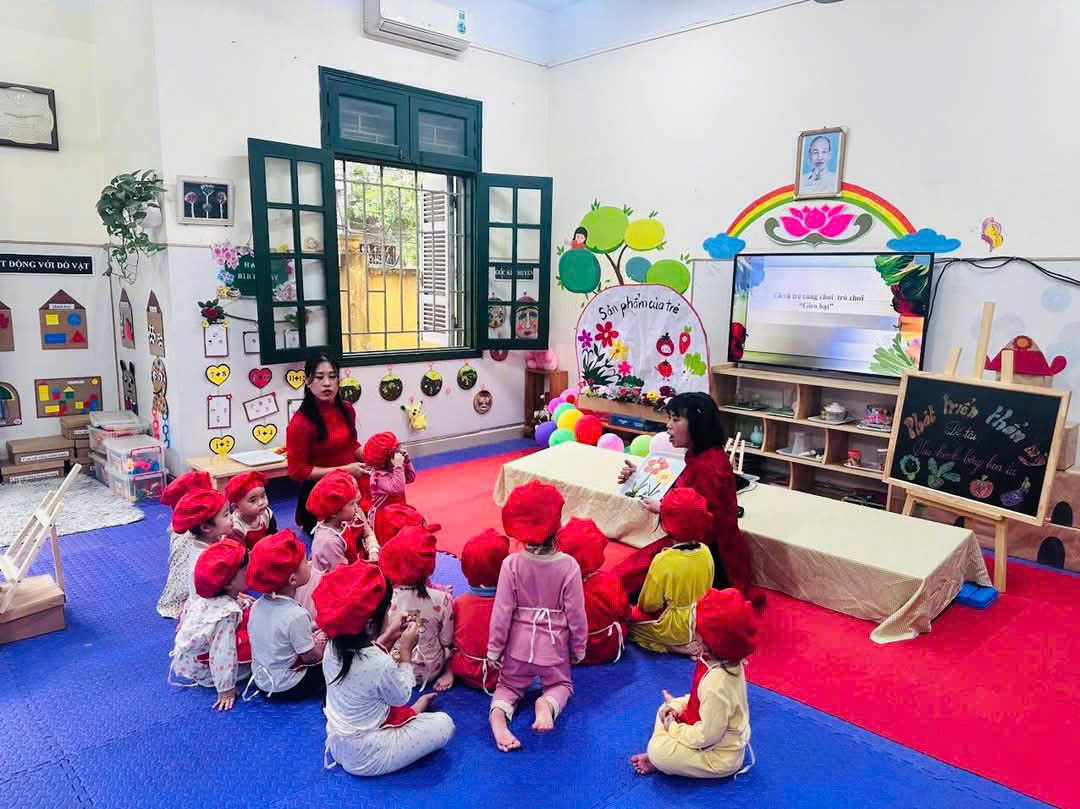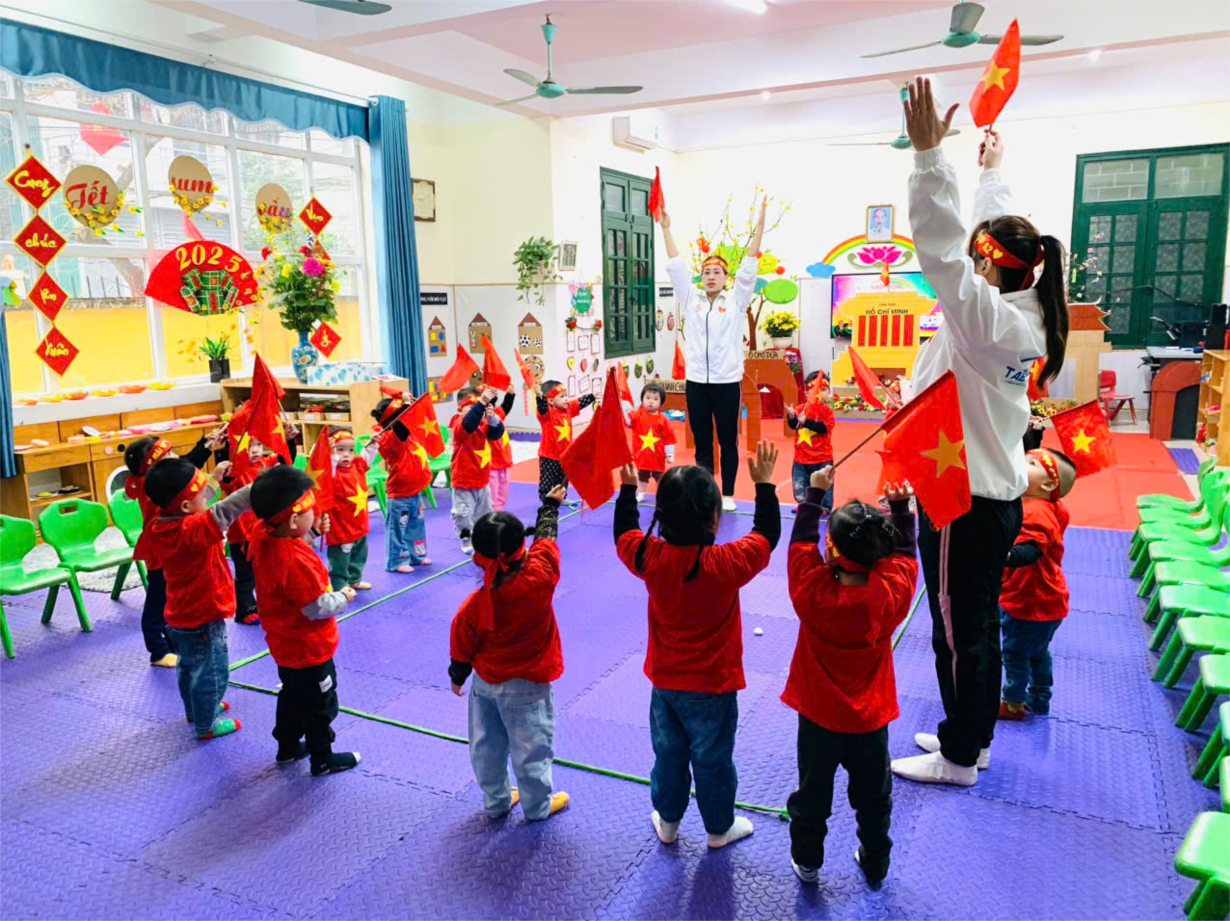 Cô và các bạn lớp nhà trẻ D1 cùng tham gia liên hoan chúng cháu vui khỏe