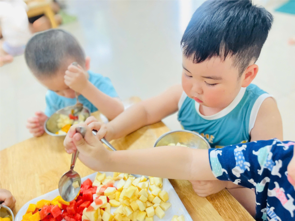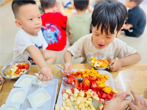 Bé trải nghiệm làm sữa chua hoa quả dầm